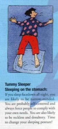 Jika anda tidur tertelungkup sepanjang malam anda cenderung berpikiran sempit. Anda mungkin egois dan selalu memaksa orang untuk memenuhi kebutuhan anda sendiri. Anda juga cenderung sembrono dan acak-acakan. Waktunya merubah posisi tidur anda?